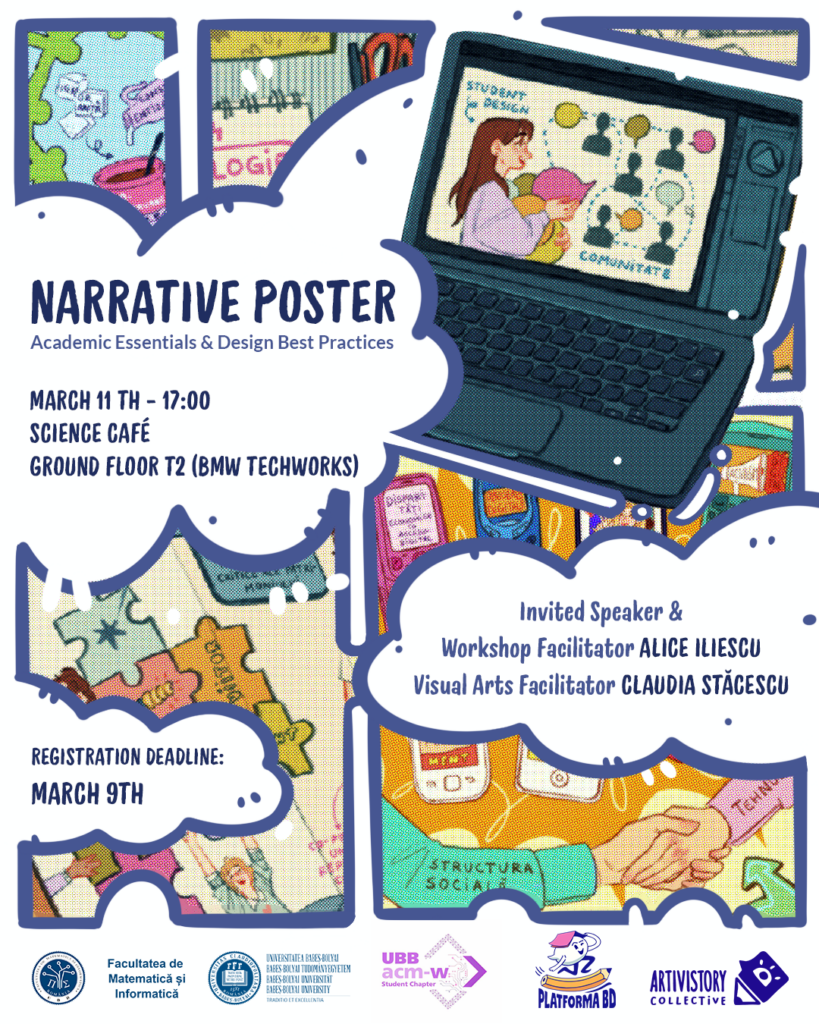 Join us for an inspiring session led by Alice Iliescu, PhD, Vice-Dean of the Faculty of Visual Arts (UAD) and member of Artivistory. This workshop focuses on the intersection of academia and design, teaching you how to translate theoretical concepts into powerful visual narratives. Discover professional secrets on building a “story” for your poster, choosing the right palettes, and mastering typography to make your research stand out.